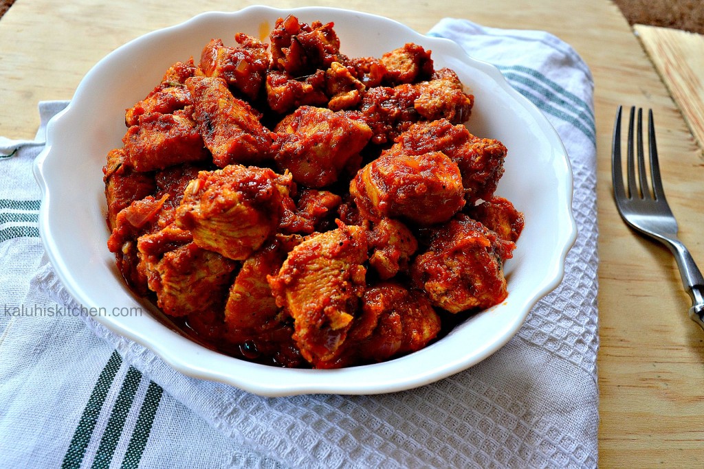 16 remove cover, there should be a thick liquid remaining with the chicken, if it is too runny, dry off excess liquids, if it is too dry add 1 cup of boiling water. This should take about 5 minutes. Drain off the excess broth from the pot and set aside. Boil the chicken for 45 minutes to one hour to make it tender. Once the tomato mixture is well cooked, stir in the yogurt and let this simmer over a low flame for a few minutes. Throw the crushed seeds into the melted chicken fat and leave to cook for about a minute. With few minutes prep and oven time, your meal should be served in about an hour and a half. Place the chicken pieces into a large sufuria/saucepan and add alittle water and some salt. Blend the chopped onions, pepper, tomato sauce, and ½ a cup of water until smooth then set aside. Add water to the chicken level. Heat remaining oil in large saucepan, cook onion, chilli powder, fenugreek, remaining ginger, garlic and turmeric, stirring, until onion softens. Get rid of the chicken skin then add one teaspoon of ginger paste, garlic paste, and 2 to 3 stock cubes. 1.rub the chicken pieces with salt and pepper.